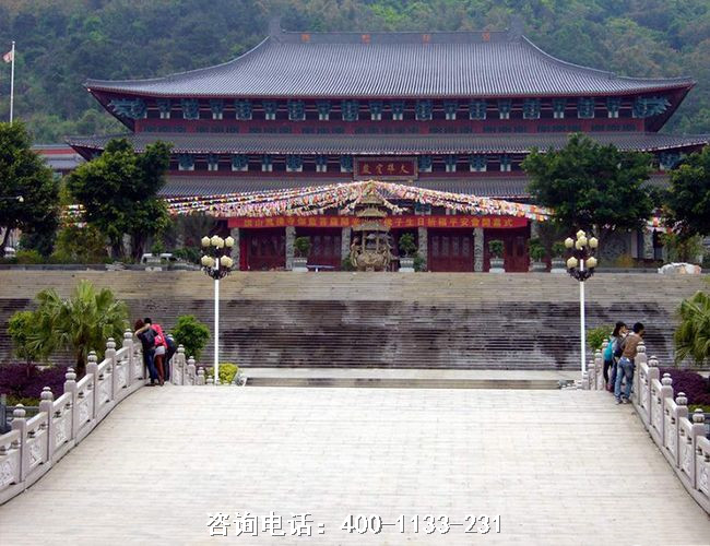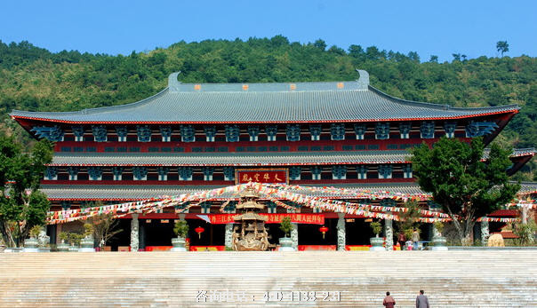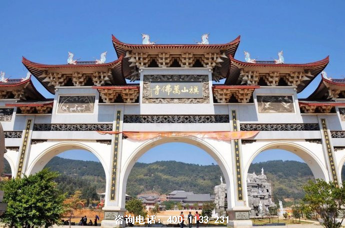 旗山是福州西郊的一座名山,与鼓山东西相对,享有"左旗右鼓,八闽二绝"的盛誉。旗山因山势逶迤似翠旗招展而得名,西北原有宋建"石松寺",惜因年代久远,寺殿己陈旧失修。近十年,世纪金源集团董事局主席黄如论先生捐資三亿元在旗山脚下源"石松寺"而建当今"万佛寺"。万佛寺塔陵座北朝南,324国道从大门前经过,占地一千三百多亩,号称东南亚第一大佛教圣地。現己建成天王殿丶大雄宝殿丶钟楼丶鼓楼丶般若堂丶地藏殿等主体建筑。傍324国道的大门口"翠旗名山"石制大牌坊气势磅礴壮观辉煌。步入牌坊,两旁是新开发的仿古商业街,道路两边人物雕像维妙维肖。 "旗山万佛寺"的石牌坊同样高大壮覌,纵观各大寺庙这样巨大的牌坊还真不多見,给人一种该寺气势宏伟先入为主的感覚。从牌坊门洞往北望去,百米之外的殿台楼宇分布在山脚,而门口到大殿之间仍是一片待开发的宽广荒地,进寺只能从左边便道上去。 万佛寺大牌坊左侧三尊覌音菩萨石刻巨大立像面西摆放,殿前花圃两边同样摆放着十几二十尊覌音石雕像,或坐或臥神态不一,天王殿两侧是钟豉楼。天王殿门中上掛"皆大欢喜"匾,笑佛两旁是高大的四大金刚,也是民间喻意的"风调雨顺"之神,怒目呲牙,让人望而生畏。 弥勒佛背面是护寺之神韦驮。出天王殿,是宽大的石桥,桥下是放生池,浑浊的水中只见大小不一的乌龟或游弋或懒洋洋地晒太阳。放生池左右两旁的建筑物有的己请进神像有的还空空如也,大雄宝殿轟立眼前,大雄宝殿各角和巨大的铜香炉之间拉起的五颜六色彩旗,仿佛该寺还沉浸在节日中。